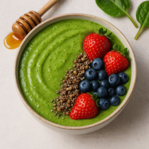 A vibrant green smoothie bowl combining spinach, banana and avocado, naturally sweetened with Manuka honey and topped with chia-crunch and seasonal berries. Quick to make, nutrient-dense and perfect for breakfast or a post-workout snack.