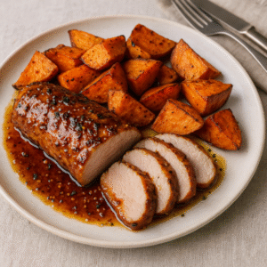 Quick yet impressive pork tenderloin glazed with Manuka honey, wholegrain mustard and lemon, served alongside roasted kumara. The Manuka glaze caramelises to give a sticky, savoury-sweet finish — perfect for midweek dinners or a weekend roast.