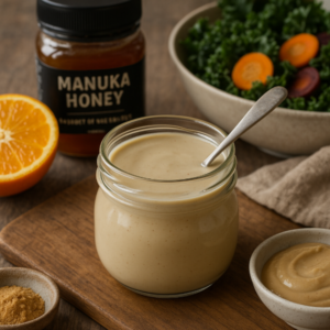 A trendy, versatile dressing combining tahini and bright lemon with the floral depth of Manuka honey. Whisk together in minutes for a drizzle that's excellent on kale salads, roasted vegetables, poke bowls or as a dip for grilled chicken. No heating required — just mix, rest briefly to let flavours meld, and use.