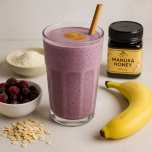 A creamy, antioxidant-packed smoothie sweetened with high-grade Manuka honey. Designed for on-the-go mornings or a post-workout boost, this smoothie blends frozen berries, banana, oats and a scoop of collagen for a filling, skin-friendly drink with a subtle floral Manuka finish.