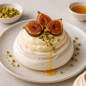 An elegant NZ-inspired dessert: individual pavlovas light as clouds, finished with a Manuka honey–infused lemon mascarpone cream, honey-roasted figs and crunchy pistachios. Perfect for dinner parties or a seasonal weekend treat.
