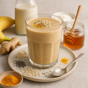 A vibrant, anti-inflammatory smoothie combining Manuka honey, turmeric and banana with creamy oat milk and spinach. Perfect for a quick breakfast or post-workout pick-me-up, inspired by recent superfood and gut-health trends.