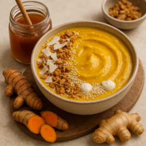 A vibrant, anti-inflammatory smoothie bowl featuring Manuka honey, fresh turmeric and ginger for a natural immunity boost — creamy, probiotic-rich and ready in minutes.