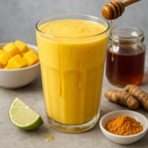 A trendy, dairy-friendly mango and turmeric smoothie flavoured with lime and a drizzle of Manuka honey. Quick to make, packed with colour and ideal for breakfast or a post-workout pick-me-up.