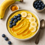 Creamy frozen banana and blueberry smoothie bowl flavoured with warming turmeric and finished with a drizzle of New Zealand Manuka honey. Perfect for a nourishing breakfast or post-workout snack — trending on socials for its colour and anti-inflammatory boost.