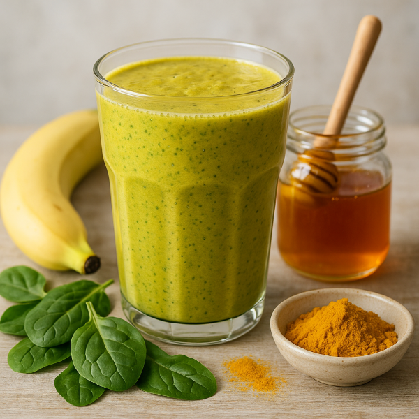 A vibrant, anti-inflammatory smoothie combining Manuka honey, turmeric and banana with creamy oat milk and spinach. Perfect for a quick breakfast or post-workout pick-me-up, inspired by recent superfood and gut-health trends.
