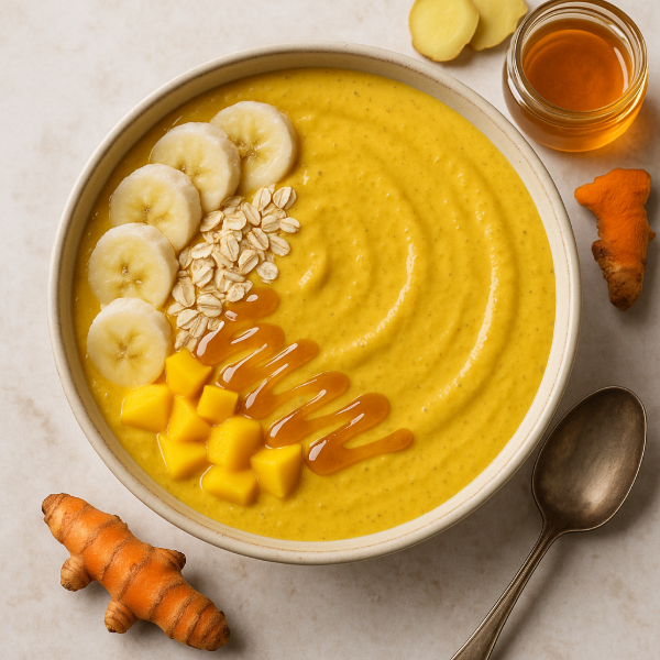 A vibrant smoothie bowl combining turmeric, ginger and UMF-certified Manuka honey for natural sweetness. Thickened with rolled oats and frozen fruit, this trendy breakfast bowl is protein-boostable and perfect for quick mornings or an Instagram-ready brunch.