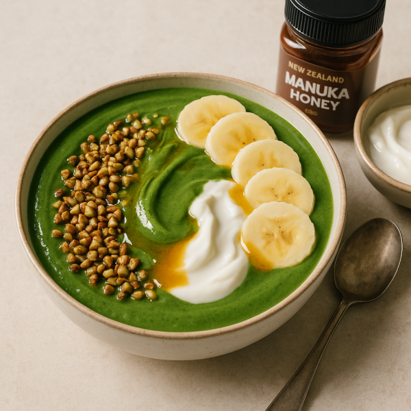 A trendy, nutrient-dense smoothie bowl using New Zealand Manuka honey for natural sweetness and depth. Blended avocado and spinach create a silky base while toasted buckinis, banana and coconut yoghurt add crunch and cream — perfect for a quick, Instagram-worthy breakfast.