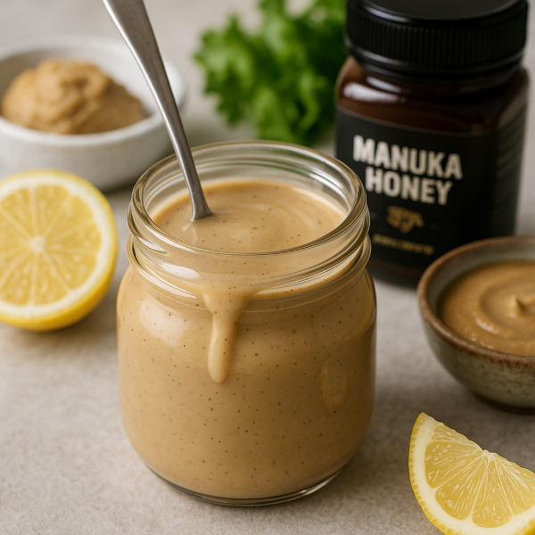 A versatile Manuka honey dressing combining white miso and tahini for creamy texture, brightened with lemon and balanced with tamari. Perfect for leafy salads, roasted vegetables or drizzling over grain bowls — trending for its umami depth and clean, floral sweetness from Manuka honey.