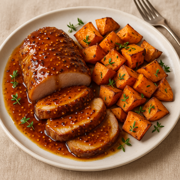 Succulent pork tenderloin glazed with a sticky Manuka honey and wholegrain mustard sauce, served alongside roasted kumara tossed with thyme. Quick to prepare and perfect for 4 people — the manuka adds floral depth and a glossy finish.