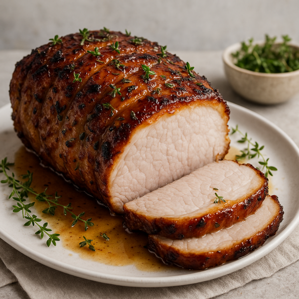 Slice the pork loin into 1–1.5 cm thick slices and serve drizzled with any pan juices and extra thyme. Serve with roast vegetables or a simple green salad.