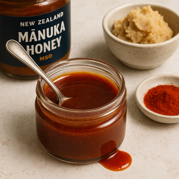 A quick, trend-forward glaze that combines New Zealand Manuka honey with white miso and smoked paprika for sweet‑smoky umami. Perfect as a finishing sauce for roasted vegetables, grilled chicken, salmon or as a sticky glaze for pork. Keeps well in the fridge and taps into current miso‑honey flavour trends.