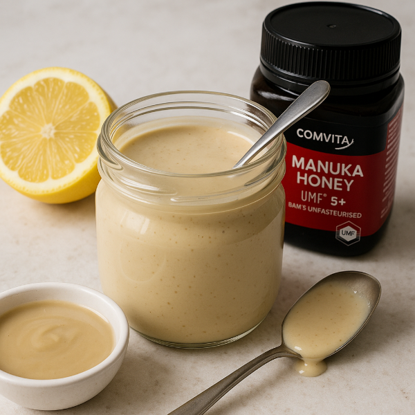 This quick no-cook dressing combines tahini’s creaminess with bright lemon and Comvita Manuka honey for a balanced sweet-tangy flavour. It’s trending as a versatile pantry dressing for salads, roasted veg and grain bowls.
