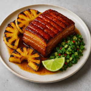 Slow-roasted pork belly brushed with a Manuka honey–miso glaze, served with charred pineapple and a zesty lime-coriander salsa. Trend-forward flavours (miso, charred fruit, and sticky honey glaze) make this a social-media-ready dinner or weekend feast.